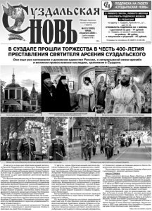 Газета основана 21 марта 1918 г. № 62 (12635) среда, 20 августа 2025 г. Общественно политическая газета 12+ В СУЗДАЛЕ ПРОШЛИ ТОРЖЕСТВА В ЧЕСТЬ 400-ЛЕТИЯ ПРЕСТАВЛЕНИЯ СВЯТИТЕЛЯ АРСЕНИЯ СУЗДАЛЬСКОГО 16 августа, в канун дня обретения мощей святителя Арсения Суздальского, митрополит Владимирский и Суздальский Никандр совершил Всенощное бдение в Успенском храме на Княжьем дворе города Суздаля. В этом году в Суздале проводятся торжества в честь 400-летия со дня преставления святителя Арсения Суздальского. Его Высокопреосвященству за богослужением сослужили: епископ Канский и Богучанский Вячеслав; секретарь Владимирского епархиального управления иеромонах Арсений (Смирнов), эконом Владимирской епархии иеромонах Иларион (Копытин), наместник Богородице-Рождественского мужского монастыря игумен Кирилл (Сурков), настоятель Свято-Александровского мужского монастыря игумен Пантелеимон (Турунтаев) и клирики Суздальского благочиния. Чин литии совершил владыка Вячеслав. На полие– лее духовенством было пропето величание святителю Арсению Суздальскому. Песнопения исполнил мужской состав Архиерейского хора под управлением Романа Климентовского. По окончании богослужения митрополит Никандр обратился к верующим с архипастырским словом и преподал им своё благословение. 17 августа, в день обретения мощей святителя Арсения Суздальского, в Суздале продолжились торжества, посвященные 400-летию со дня его преставления. Центральным событием дня стала Божественная Литургия в Успенском храме на Княжьем дворе, которую возглавил митрополит Владимирский и Суздальский Никандр. Его Высокопреосвященству за богослужением сослужили: епископ Канский и Богучанский Вячеслав, секретарь Владимирского епархиального управления иеромонах Арсений (Смирнов), эконом Владимирской епархии иеромонах Иларион (Копытин), наместник Богородице-Рождественского мужского монастыря игумен Кирилл (Сурков) и клирики Суздальского благочиния. Богослужебные песнопения исполнил мужской состав Архиерейского хора Свято-Успенского кафедрального собора. По окончании Литургии состоялся праздничный крестный ход. В нем приняли участие духовенство и многочисленные прихожане храмов Суздаля и Суздальского района. Под торжественный звон колоколов всех городских храмов шествие с иконой святителя Арсения и частицей его святых мощей направилось от Успенского храма на Княжьем дворе ко Свято-Покровскому женскому монастырю. После крестного хода владыка Никандр обратился к молящимся с архипастырским словом. НАША СПРАВКА Мощи святителя Арсения были обретены в 2005 году по инициативе Элладской Православной Церкви. По благословению Патриарха Алексия II в Суздальском кремле провели археологические исследования, и 17 августа 2005 года останки святителя были обнаружены в Рождественском соборе. После экспертиз, подтвердивших их подлинность, мощи перенесли в Успенскую церковь, где они почивают и сегодня. Святитель Арсений, грек по происхождению, прибыл в Россию в конце XVI века в составе делегации Константинопольского Патриарха. Он стал свидетелем учреждения Патриаршества на Руси и остался в Москве, позже возглавив Суздальскую кафедру. Его литературные труды — ценнейший источник о жизни России в эпоху Смутного времени. После кончины в 1625 году святитель был погребен в Суздале, где уже тогда поч