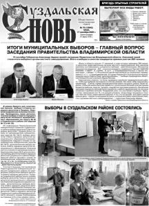 Газета основана 21 марта 1918 г. № 70 (12643) среда, 17 сентября 2025 г. Общественно политическая газета 12+ «Всего в области прошли 17 кампаний, в ходе которых замещено 284 мандата депутатов представительных органов местного самоуправления. Все кампании признаны состоявшимися, а результаты выборов – действительными. Абсолютное большинство мандатов – 247 – получили кандидаты, выдвинутые Партией «ЕДИНАЯ РОССИЯ». У ЛДПР – 9, у КПРФ – 6, по 5 – у «Справедливой России» и партии «Новые люди», 1 мандат – у «Российской партии пенсионеров за социальную справедливость» и 11 – у самовыдвиженцев. В городе Радужный и Кольчугинском муниципальном округе Советы будут однопартийными», – сообщил председатель областной Избирательной комиссии Вадим Минаев. Глава региона отметил, что была проведена серьёзная предварительная работа, чтобы дни выборов проходили в штатном режиме, без каких-либо нарушений и провокаций. «Сейчас главам муниципалитетов важно настроить работу таким образом, чтобы как можно быстрее перейти от политических баталий к рассмотрению бюджетов районов, округов, городов, к выработке программ развития, обновлению программ социально экономического развития, к работе над решением тех или иных вопросов и проблем жителей. Поздравляю всех, кто участвовал в выборах. Здесь, считаю, проигравших нет. Те, кто прошёл в Советы, теперь будут загружены в течение пяти лет очень ответственной работой. А тот, кто не прошёл, все равно сделал важное дело – поднял те насущные вопросы, которые всё равно нужно решать вместе с органами местного самоуправления», – подытожил Александр Авдеев. Пресс-служба Правительства Владимирской области. ИТОГИ МУНИЦИПАЛЬНЫХ ВЫБОРОВ – ГЛАВНЫЙ ВОПРОС ЗАСЕДАНИЯ ПРАВИТЕЛЬСТВА ВЛАДИМИРСКОЙ ОБЛАСТИ 15 сентября Губернатор Александр Авдеев провёл заседание Правительства Владимирской области. Ключевой темой стали итоги выборов в органы местного самоуправления. Всего в выборах в качестве кандидатов приняли участие 895 человек. Александр Авдеев. Вадим Минаев. ВЫБОРЫ В СУЗДАЛЬСКОМ РАЙОНЕ СОСТОЯЛИСЬ В рамках Единого дня голосования прошли выборы в Советы народных депутатов в Суздале, Новоалександровском сельском поселении. Проводились также дополнительные выборы в Советы народных депутатов Селецкого муниципального образования (по округу № 9) и Суздальского района (по округам № 15 и № 19). По информации Территориальной избирательной комиссии Суздальского района выборы депутатов Совета народных депутатов г. Суздаля пятого созыва по одномандатным избирательным округам №1-№15; выборы депутатов Совета народных депутатов муниципального образования Новоалександровское седьмого созыва по одномандатным избирательным округам №1-№15; дополнительные выборы депутата Совета народных депутатов муниципального образования Селецкое шестого созыва по одномандатному избирательному округу № 9; дополнительные выборы депутатов Совета народных депутатов Суздальского района Владимирской области восьмого созыва по одномандатным избирательным округам № 15 и № 19 ПРИЗНАНЫ СОСТОЯВШИМИСЯ И РЕЗУЛЬТАТЫ ВЫБОРОВ - ДЕЙСТВИТЕЛЬНЫМИ. Соответствующие постановления Территориальной избирательной комиссии Суздальского района об определении результатов выборов депутата Совета народных депутатов г. Суздаля Суздальского района пятого созыва; выборо