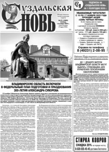 Газета основана 21 марта 1918 г. № 87 (12660) пятница, 14 ноября 2025 г. Общественно политическая газета 12+ Справки по телефону 8 (49231) 2-08-95 ПОДПИСКА НА «СУЗДАЛЬСКУЮ НОВЬ» НА 1 ПОЛУГОДИЕ 2026 г. УВАЖАЕМЫЕ ЧИТАТЕЛИ! С 10 ПО 17 НОЯБРЯ 2025 ГОДА ПРОХОДИТ АКЦИЯ «СЕМЬ ЧЕРНЫХ ПЯТНИЦ» В этот период цена на газету «Суздальская новь» с доставкой почтальоном СНИЖЕНА! Стоимость подписки на 6 месяцев - 664 руб. (вместо 998 руб.) на 1 месяц - 111 руб. (вместо 165 руб.) Вы сможете подписаться во всех почтовых отделениях г. Суздаля и Суздальского района, а также в редакции по адресу: г. Суздаль, Красная площадь, д. 1 (адм. г. Суздаля, каб. №12). Н Реклама Напомним, что в военной биографии Александра Суворова был период, когда он командовал дивизией, расквартированной во Владимирском наместничестве. В те годы он проявил себя не только как военный, но и как образцовый хозяин в своих имениях, в том числе в селе Ундол (ныне город Лакинск). После его кончины имение унаследовала дочь Наталья – «Суворочка». Краеведы уверены, что именно в Ундоле Суворов написал свою знаменитую книгу «Наука побеждать». Кроме того, в селе Кистыш под Суздалем находится родовое имение Суворовых. Александр Васильевич построил там каменный храм на месте деревянного, который возвёл его отец Василий Иванович. В 2020 году в Кистыше был установлен памятник генералиссимусу по национальному проекту «Культура» (с этого года он стал частью нацпроекта «Семья»). А в прошлом году в селе открыли Музей А.В. Суворова. «Владимирская региональная общественная организация «Архитектурно-исторический комплекс генералиссимуса А.В. Суворова» при поддержке областных и местных властей создаёт памятное пространство в Кистыше. Архитектурно-исторический комплекс развивается и уже стал частью межрегионального маршрута «Суворов. Наука побеждать», объединяющего Владимирскую и Ивановскую области. В Собинском округе разработали туристический маршрут «По суворовским местам». Реконструированная недавно лакинская школа названа в честь генералиссимуса. Пять лет подготовки к юбилею великого полководца будут наполнены мероприятиями. Мы передаём молодому поколению чувство гордости за историю России и её Вооруженные Силы», – говорит глава региона Александр Авдеев. Во Владимирской области ведётся популяризация наследия Александра Суворова среди молодёжи. Ежегодно, 24 ноября, в день рождения непобедимого полководца, в регионе проводятся «Суворовские чтения». Основная аудитория конференции – учащиеся образовательных организаций. С сентября 2025 года стартовал проект «Суворовский класс», который вошёл в план мероприятий федерального уровня. Он предусматривает проведение уроков для школьников с посещением музея в селе Кистыш. В федеральный план Владимирская область подала ещё несколько мероприятий. В их числе – профильные летние смены «Суворовец» на базе загородных оздоровительных лагерей; военно-историческая реконструкция, посвящённая одному из сражений русскотурецких войн; межрегиональные краеведческая конференция «А.В.Суворов: жизнь на благо Отечества» и военно-историческая игра для воспитанников кадетских классов и юнармейских отрядов; всероссийская молодёжная научно-практическая конференция «Тяжело в учении – легко в бою»; выпуск юбилейного календаря и литературно-краеведческого издания «Суворов и Владимирский край»; п