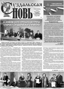 Газета основана 21 марта 1918 г. № 97 (12670) пятница, 19 декабря 2025 г. Общественно политическая газета 12+ УВАЖАЕМЫЕ СОТРУДНИКИ И ВЕТЕРАНЫ УПРАВЛЕНИЯ ФЕДЕРАЛЬНОЙ СЛУЖБЫ БЕЗОПАСНОСТИ РОССИИ ПО ВЛАДИМИРСКОЙ ОБЛАСТИ! Поздравляю вас с профессиональным праздником. Вы первыми встаёте на пути тех, кто пытается подорвать конституционный строй, внести раскол в наше общество и ослабить Россию. Непримиримая борьба с терроризмом, экстремизмом, коррупцией и другими угрозами – ваш ежедневный труд, требующий высочайшего профессионализма, верности долгу и готовности к самопожертвованию. С началом специальной военной операции роль силовиков, обеспечивающих госбезопасность, возросла многократно. Ваша компетентность, оперативность и умение предвидеть развитие событий позволяют эффективно противодействовать замыслам противника. Вы обеспечиваете безопасность мирного населения, предотвращаете диверсии и теракты, выявляете и нейтрализуете вражеских агентов. Особая благодарность – ветеранам ФСБ, которые являются примером для молодого поколения сотрудников. Именно благодаря вашей мудрости и знаниям формируется элита российских спецслужб, способная решать задачи любой сложности. Желаю всем вам крепкого здоровья, благополучия, успехов на службе во имя Родины. А.А. АВДЕЕВ, Губернатор области. Местное самоуправление – это фундамент гражданского общества, а старосты – его живые кирпичики. Именно они, находясь в непосредственной близости к людям, первыми узнают о проблемах и нуждах своих земляков. Они – надежные помощники в решении самых разнообразных вопросов, от благоустройства до социальной поддержки. Старосты – это, действительно, сердце местного самоуправления, люди, которые своим трудом и неравнодушием делают наши села и деревни по-настоящему живыми и развивающимися. Важность роли старост была отмечена и на самом высоком уровне. Недавно Губернатор региона Александр Авдеев установил региональный День старост – 3-я пятница августа. Эта дата стала символом признания их вклада в жизнь области и стимулом для дальнейшей плодотворной работы. Встреча со старостами в ДК села Новое - еще одно подтверждение этого признания. Участников встречи поприветствовала первый заместитель главы администрации района по внутренней и социальной политике Татьяна Срибная. Она поблагодарила всех старост за их неустанный труд, за преданность своему делу и за ту неоценимую помощь, которую они оказывают в решении повседневных задач. Татьяна Срибная также подвела итоги года, рассказала о социально-экономическом развитии района, подчеркнув, что именно благодаря активной позиции старост, многие инициативы на местах находят свое успешное воплощение. Заместитель главы администрации района Александр Авсеенок рассказал о проделанной за год работе в сфере ЖКХ, обозначил планы на следующий год и ответил на вопросы старост. Встреча прошла в формате конструктивного диалога. В ней приняли участие и другие представители власти и профильных служб, готовые ответить на вопросы старост и обсудить актуальные проблемы. Александр Захаров, депутат Законодательного Собрания Владимирской области, председатель Ассоциации сельских старост рассказал о деятельности Ассоциации, ее задачах и возможностях для поддержки старост. Константин Глебов, начальник караула 26-й пожарно