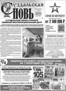 Газета основана 21 марта 1918 г. № 100 (12673) понедельник, 29 декабря 2025 г. Общественно политическая газета 12+ ОСТАВАЙТЕСЬ С НАМИ! БУДЬТЕ В КУРСЕ СОБЫТИЙ ГОРОДА, РАЙОНА, ОБЛАСТИ! Справки по телефону 8 (49231) 2-08-95 Реклама ПОДПИСКА НА ГАЗЕТУ «СУЗДАЛЬСКАЯ НОВЬ» НА 1 ПОЛУГОДИЕ 2026 ГОДА ОФОРМИТЬ ПОДПИСКУ МОЖНО В РЕДАКЦИИ С ЛЮБОГО МЕСЯЦА по адресу: г. Суздаль, Красная пл., д.1, каб.12,18. Стоимость подписки: с доставкой на дом - 460 руб.(г. Суздаль, не менее 5 экземпляров); по району - 490 руб.; с получением в редакции - 400 руб. на 6 месяцев. УВАЖАЕМЫЕ ЖИТЕЛИ ПОСЕЛКА КРАСНОГВАРДЕЙСКИЙ, СЕЛ ПАВЛОВСКОЕ, ПОРЕЦКОЕ, ОМУТСКОЕ, ТУРТИНО! Сообщаем вам, что у редакции есть возможность доставлять вам газету «Суздальская новь». Подписаться на газету можно в Красногвардейской сельской библиотеке у библиотекаря Сараевой Елены Викторовны, в Павловской библиотеке у библиотекаря Татьяны Геннадьевны Васильевой, в с. Порецкое у Галины Александровны Молчановой в магазине, в с.Омутское у библиотекаря Веры Владимировны Савельевой, в с. Туртино у библиотекаря Светланы Степановны Крючковой. УСПЕЙТЕ ПОДПИСАТЬСЯ ПО ЦЕНАМ ЭТОГО ГОДА! ВНИМАНИЮ ГРАЖДАН ! Министерство цифрового развития Владимирской области сообщает, что из-за растущего числа случаев мошенничества, когда пользователи Госуслуг непреднамеренно передают SMS-коды для входа на портал, Минцифры России было принято решение постепенно отказаться от подтверждения входа на портал через SMS (пока это решение касается только входа на «Госуслуги» через мобильные устройства). Подробная информация размещена на официальном сайте Министерства цифрового развития по адресу: https://digital. avo.ru/-/obnovlenie-sistemy-vhodanagosuslugi. В церемонии открытия приняли участие заместитель Министра социальной защиты населения Екатерина Сергеева, первый заместитель главы администрации района Татьяна Срибная, благочинный по Суздальскому округу отец Михаил, координаторы Суздальского филиала фонда «Защитники Отечества», руководители и представители государственных и общественных организаций, многодетные семьи и семьи участников СВО. В своих выступлениях Екатерина Сергеева, Татьяна Срибная и отец Михаил подчеркнули неоценимую роль семьи в современном обществе, отметив, что создание таких центров является прямым отражением государственной политики, направленной на укрепление семейных ценностей и оказание всесторонней поддержки. Первые посетители уже смогли оценить возможности нового центра. Специалисты отдела социальной защиты и представители фонда «Защитники Отечества» провели консультации, ответив на актуальные вопросы многодетных родителей и семей, чьи близкие сейчас на передовой. Особые слова благодарности прозвучали от многодетной мамы, чей муж сейчас находится в зоне боевых действий. Она выразила радость по поводу появления места, где ее семья может получить всестороннюю помощь и поддержку. Трогательным моментом стало выступление ее дочери Василисы, которая прочитала стихотворение о маме, вызвав искренние эмоции у всех присутствующих. Музыкальные композиции о семье и любви в исполнении Натальи Гусевой наполнили мероприятие теплом и душевностью. В завершение мероприятия семьи получили новогодние подарки. https://vk.com/suzdalregion В СУЗДАЛЬСКОМ РАЙОНЕ ОТКРЫЛСЯ СЕМЕЙНЫЙ МНОГОФУНКЦИОНАЛЬНЫЙ ЦЕНТР В администрации района состоялось его торжественное откры